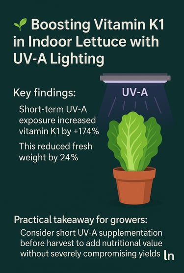 A recent study tested whether ๐๐-๐ ๐ฅ๐ข๐ ๐ก๐ญ (389 nm) can increase phylloquinone (vitamin K1) in romaine lettuce.