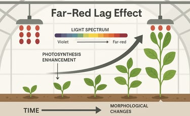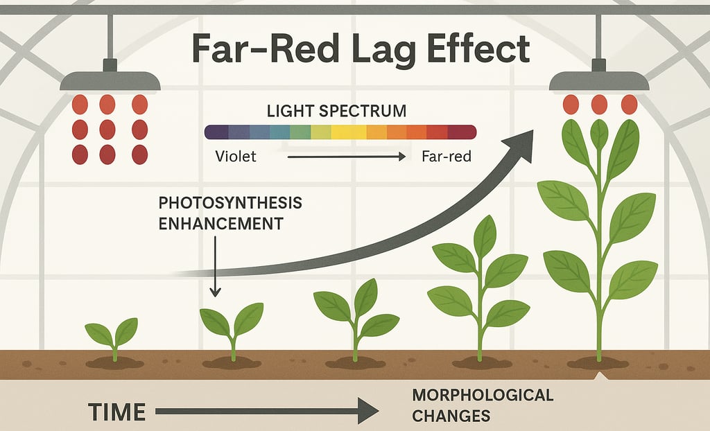 The far-red lag effect means that when you add far-red light to your greenhouse lighting, the benefits (like faster growth or bigger plants) often show up after a delayโusually several days or weeks, not immediately.